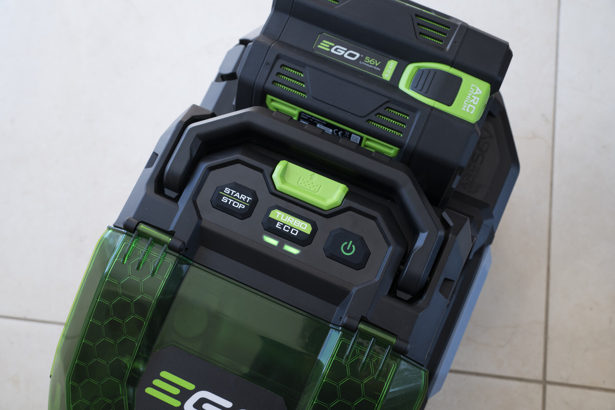 Při použití např. baterie EGO 5Ah získáte až 90 pracovních minut na jedno nabití baterie v režimu ECO, 33 minut nebo 35 minut v režimu vysokého výkonu "TURBO".